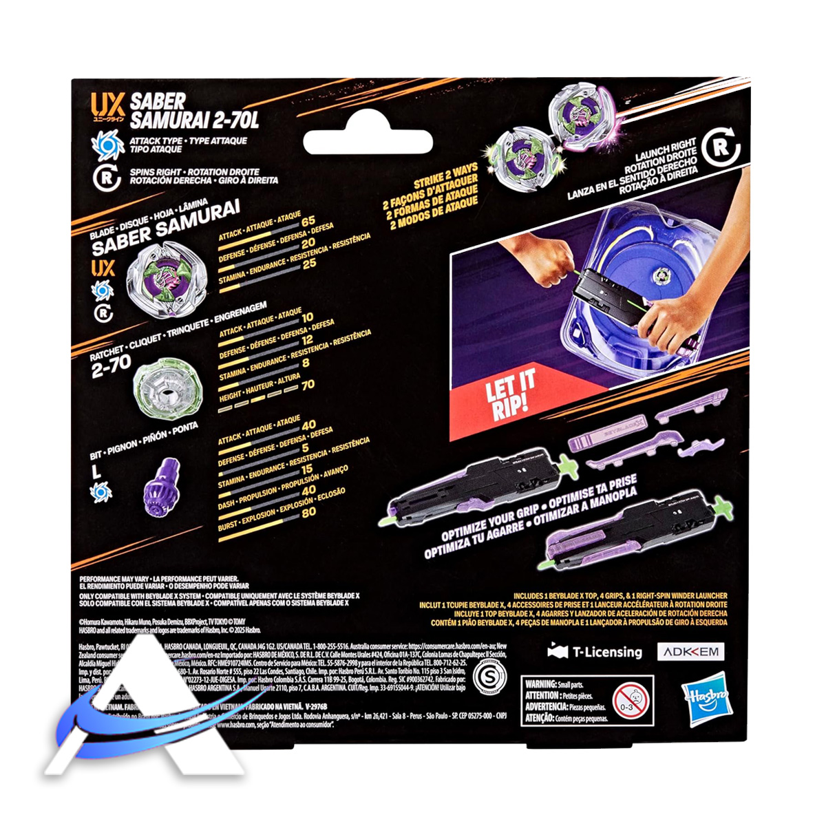 Experience the thrill of the next generation of Beyblade: Beyblade X stadiums, launchers, and battle tops with the Beyblade X Saber Samurai 2-70L, which includes 1 right-spin Attack Type top and launcher (requires Beystadium, sold separately).