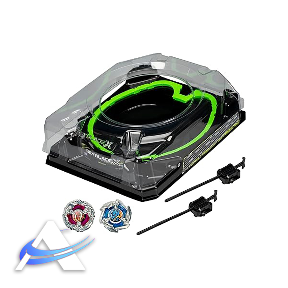 Includes: Xtreme Battle set Beystadium, 2 Beyblade x tops, 2 Launchers and 2 ripcords.