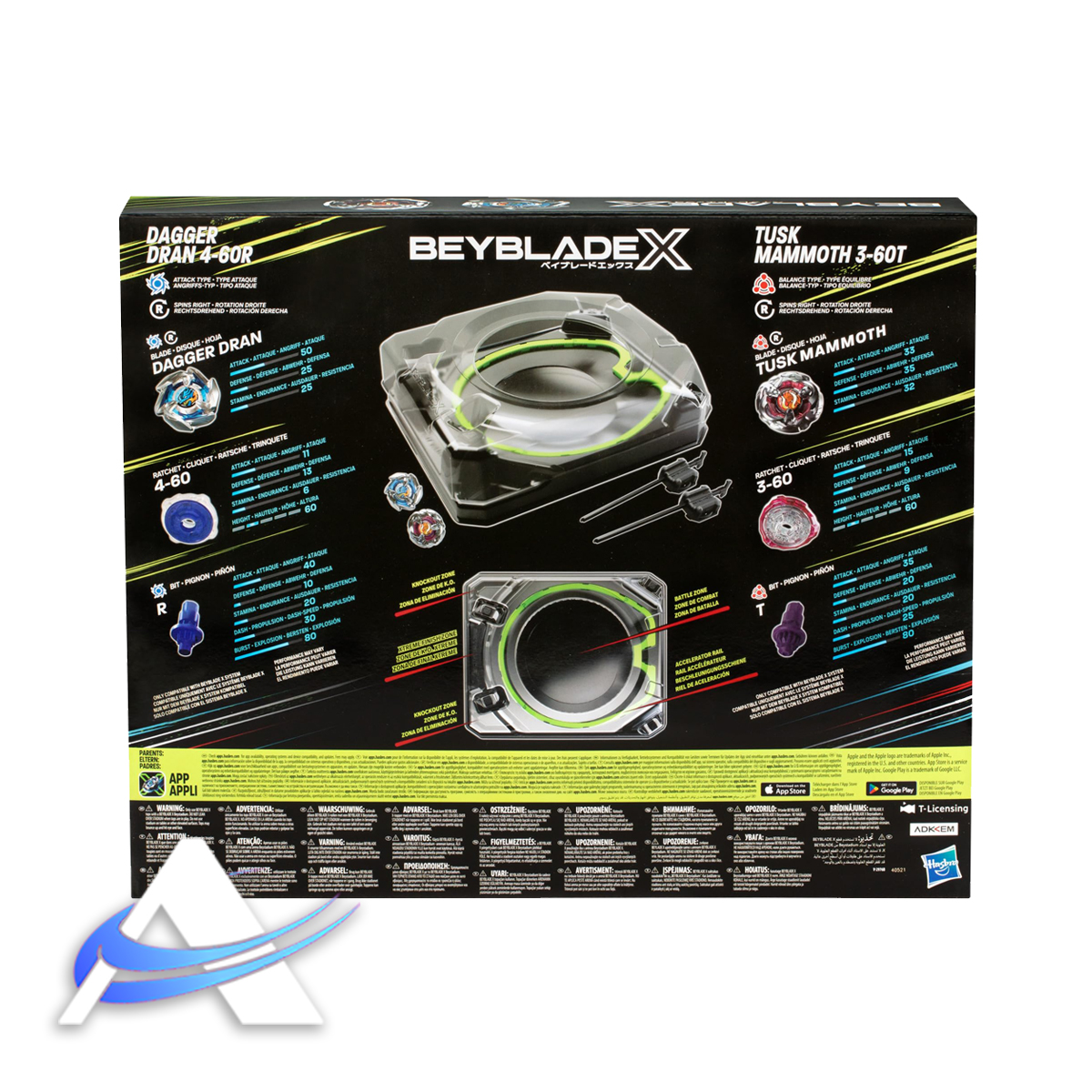 Experience the thrill of the next generation of Beyblade tops, Beyblade X. The Beyblade X Xtreme Battle Set has all you need to begin your quest for Beymastery. The Xtreme Beystadium and 2 Beyblade X right-spin tops feature the X-Celerator Gear System to level up your game and prove it in battle! When the gear of the top engages the stadium’s X-Celerator Rail, it can super-accelerate into an Xtreme Dash rocketing it around the arena for crushing collisions and epic bursts. Use the 2 launchers to unleash the Dagger Dran 4-60R Attack Type and Tusk Mammoth 3-60T Balance Type tops in a frenzy of fury. Bladers launch their top against their opponent’s scoring points with each confrontation first to 4 points wins. Mix and match the interchangeable blade, ratchet, and bit with the layers of other Beyblade X tops (sold separately) to create your own unsurpassable Bey. Hasbro Beyblade toys with authentic Takara Tomy die-cast metal tops make great kids gifts for boys and girls ages 8 and up.