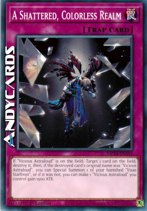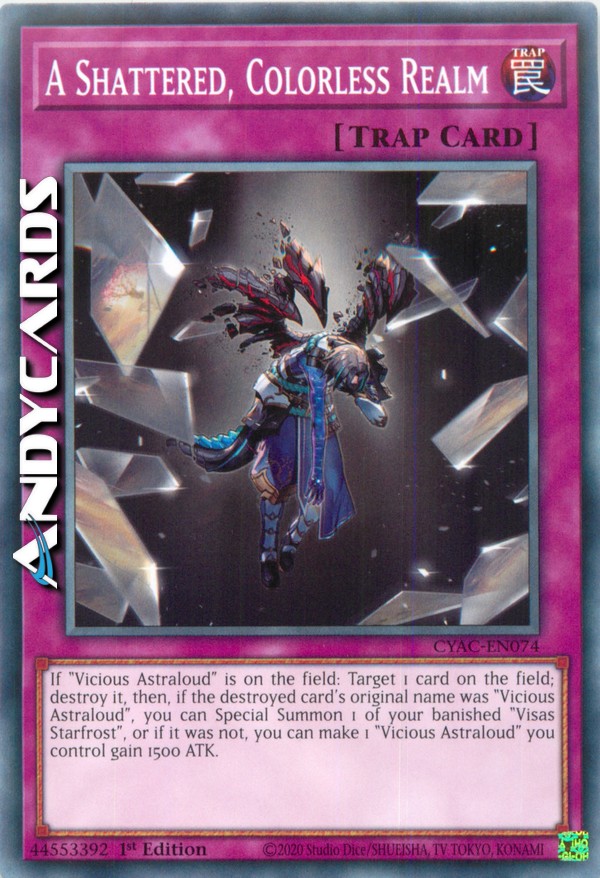 If "Vicious Astraloud" is on the field: Target 1 card on the field; destroy it, then, if the destroyed card's original name was "Vicious Astraloud", you can Special Summon 1 of your banished "Visas Starfrost", or if it was not, you can make 1 "Vicious Astraloud" you control gain 1500 ATK.