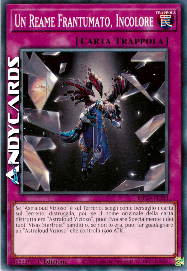 Se "Astraloud Vizioso" è sul Terreno: scegli come bersaglio 1 carta sul Terreno; distruggila, poi, se il nome originale della carta distrutta era "Astraloud Vizioso", puoi Evocare Specialmente 1 dei tuoi "Visas Starfrost" banditi o, se non lo era, puoi far guadagnare a 1 "Astraloud Vizioso" che controlli 1500 ATK.