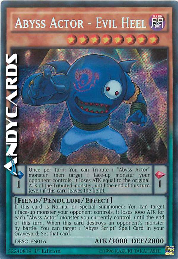 If this card is Normal or Special Summoned: You can target 1 face-up monster your opponent controls; it loses 1000 ATK for each "Abyss Actor" monster you currently control, until the end of this turn. When this card destroys an opponent's monster by battle: You can target 1 "Abyss Script" Spell Card in your Graveyard; Setthat card. Pendulum Effect: Once per turn: You can Tribute 1 "Abyss Actor" monster, then target 1 face-up monster your opponent controls; it loses ATK equal to the original ATK of the Tributed monster, until the end of this turn (even if this card leaves the field).