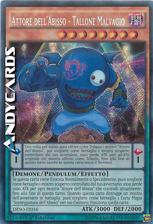 1 Una volta per turno: puoi offrire come Tributo 1 mostro "Attore dell'Abisso", poi scegliere come bersaglio 1 mostro scoperto controllato dal tuo avversario; esso perde ATK pari all'ATK originale del mostro offerto come Tributo, fino alla fine di questo turno (anche se questa carta lascia il Terreno). Se questa carta viene Evocata Normalmente o Specialmente: puoi scegliere come bersaglio 1 mostro scoperto controllato dal tuo avversario; esso perde 1000 ATK per ogni mostro "Attore dell'Abisso" che controlli attualmente, fino alla fine di questo turno. Quando questa carta distrugge un mostro dell'avversario in battaglia: puoi scegliere come bersaglio 1 Carta Magia "Sceneggiatura dell'Abisso" nel tuo Cimitero; Posiziona quella carta.