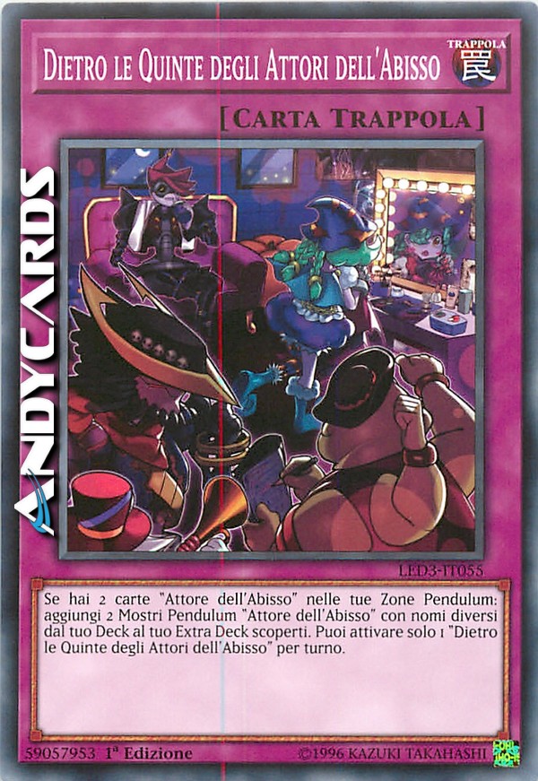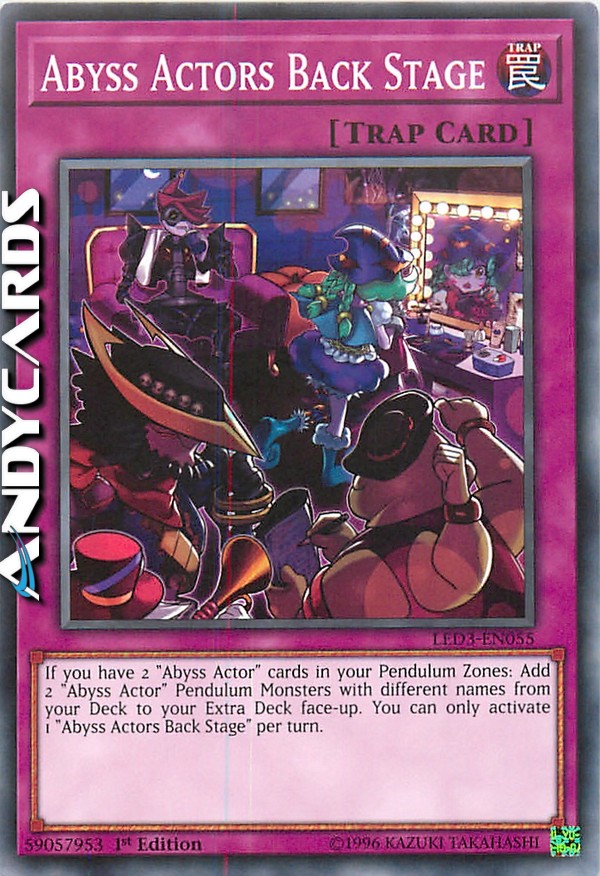 Se hai 2 carte "Attore dell'Abisso" nelle tue Zone Pendulum: aggiungi 2 Mostri Pendulum "Attore dell'Abisso" con nomi diversi dal tuo Deck al tuo Extra Deck scoperti. Puoi attivare solo 1 "Dietro le Quinte degli Attori dell'Abisso" per turno.