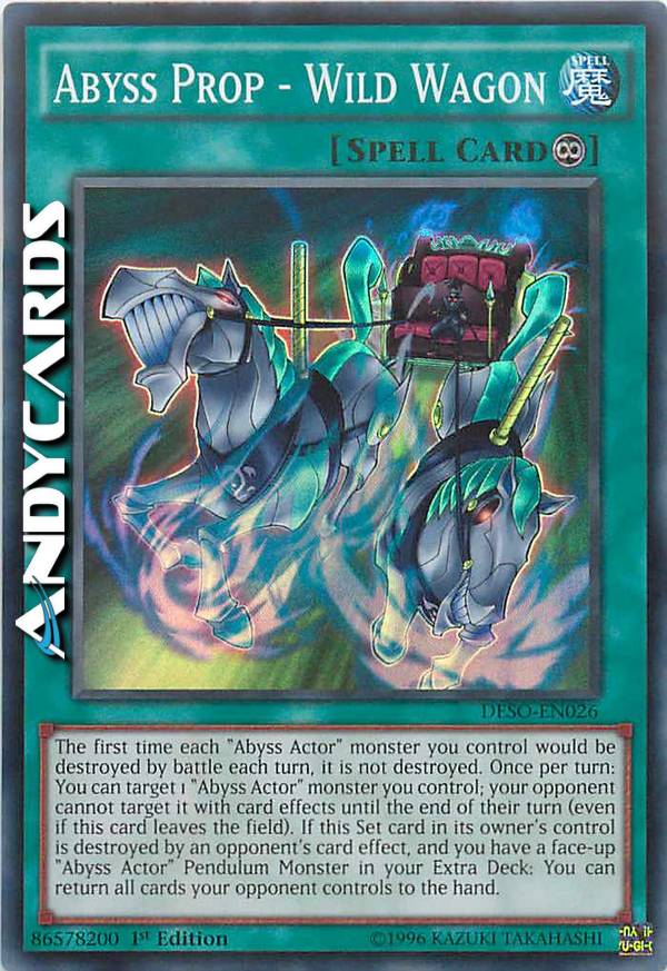 The first time each "Abyss Actor" monster you control would be destroyed by battle each turn, it is not destroyed. Once per turn: You can target 1 "Abyss Actor" monster you control; your opponent cannot target it with card effects until the end of their turn (even if this card leaves the field). If this Set card in its owner's control is destroyed by an opponent's card effect, and you have a face-up "Abyss Actor" Pendulum Monsterin your Extra Deck: You can return all cards your opponent controls to the hand.