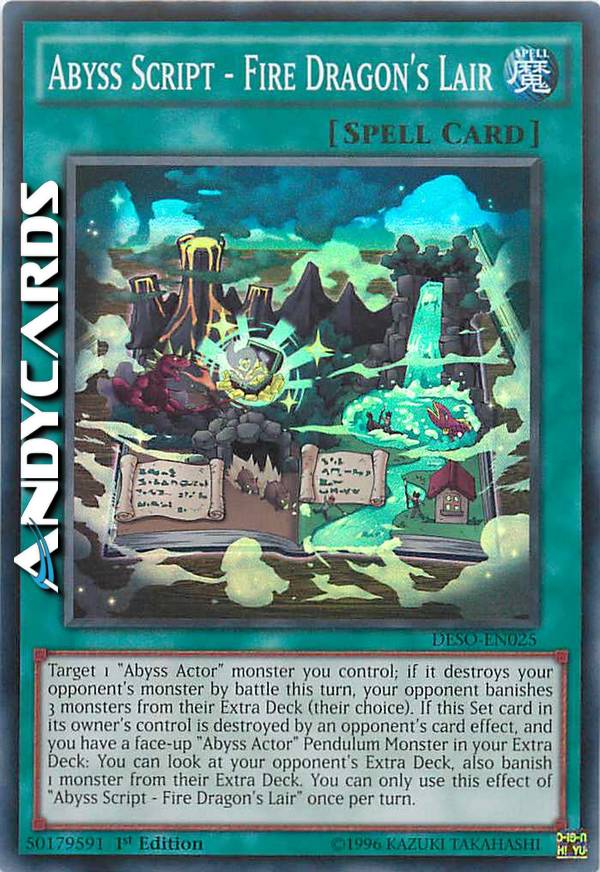 Scegli come bersaglio 1 mostro "Attore dell'Abisso" che controlli; se esso distrugge un mostro del tuo avversario in battaglia in questo turno, il tuo avversario bandisce 3 mostri dal suo Extra Deck (a sua scelta). Se questa carta Posizionata sotto il controllo del suo proprietario viene distrutta dall'effetto di una carta dell'avversario, e tu hai un Mostro Pendulum "Attore dell'Abisso" scoperto nel tuo Extra Deck: puoi guardare l'Extra Deck del tuo avversario, inoltre bandisci 1 mostro dal suo Extra Deck. Puoi utilizzare questo effetto di "Sceneggiatura dell'Abisso - Tana del Drago di Fuoco" una sola volta per turno.