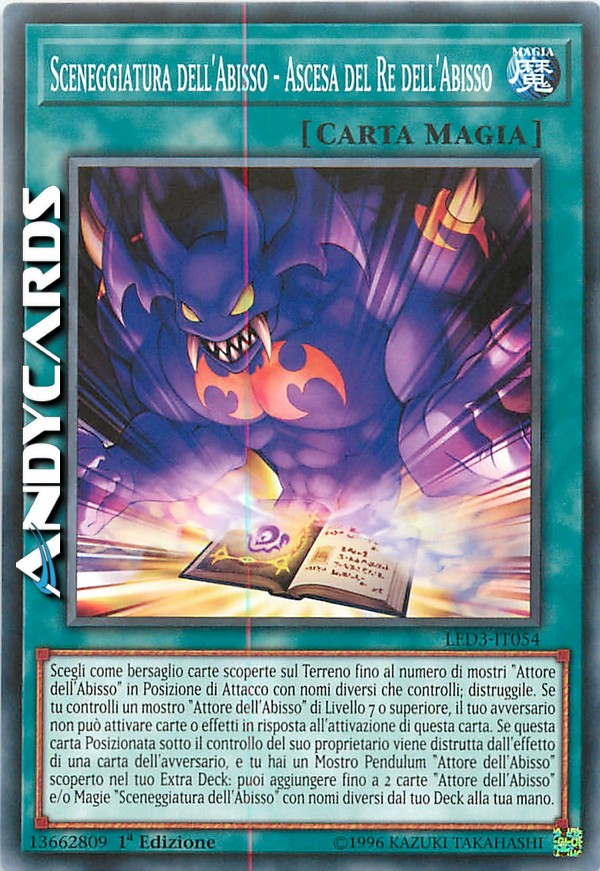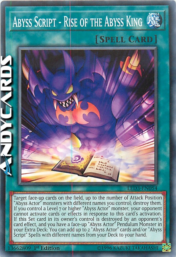 Scegli come bersaglio carte scoperte sul Terreno fino al numero di mostri "Attore dell'Abisso" in Posizione di Attacco con nomi diversi che controlli; distruggile. Se tu controlli un mostro "Attore dell'Abisso" di Livello 7 o superiore, il tuo avversario non può attivare carte o effetti in risposta all'attivazione di questa carta. Se questa carta Posizionata sotto il controllo del suo proprietario viene distrutta dall'effetto di una carta dell'avversario, e tu hai un Mostro Pendulum "Attore dell'Abisso" scoperto nel tuo Extra Deck: puoi aggiungere fino a 2 carte "Attore dell'Abisso" e/o Magie "Sceneggiatura dell'Abisso" con nomi diversi dal tuo Deck alla tua mano.