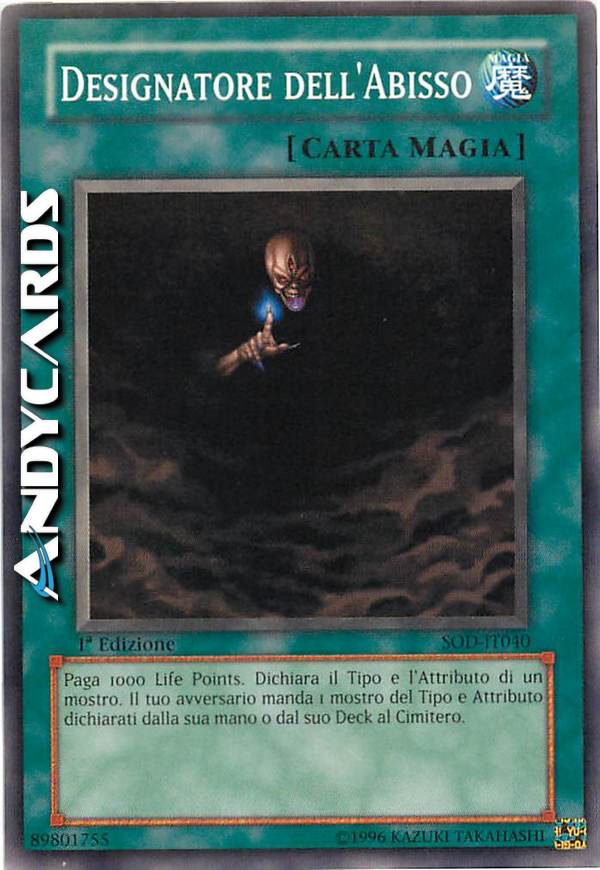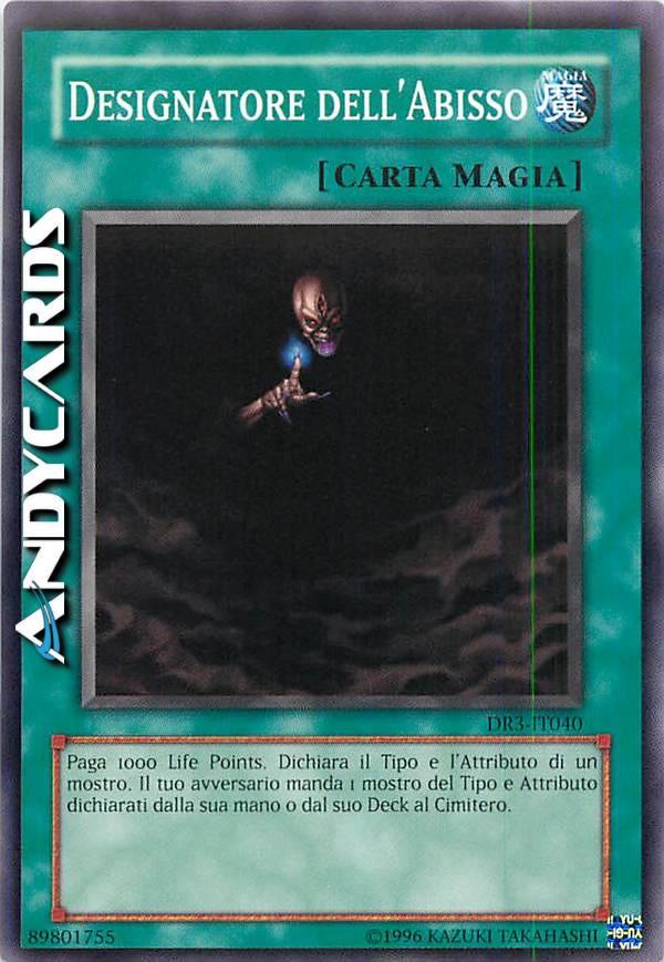 Paga 1000 Life Points. Dichiara il Tipo e l'Attributo di un mostro. Il tuo avversario manda 1 mostro del Tipo e Attributo dichiarati dalla sua mano o dal suo Deck al Cimitero.