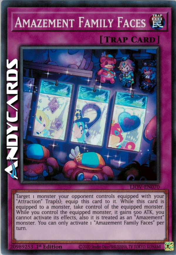 Target 1 monster your opponent controls equipped with your "Attraction" Trap(s); equip this card to it. While this card is equipped to a monster, take control of the equipped monster. While you control the equipped monster, it gains 500 ATK, you cannot activate its effects, also it is treated as an "Amazement" monster. You can only activate 1 "Amazement Family Faces" per turn.