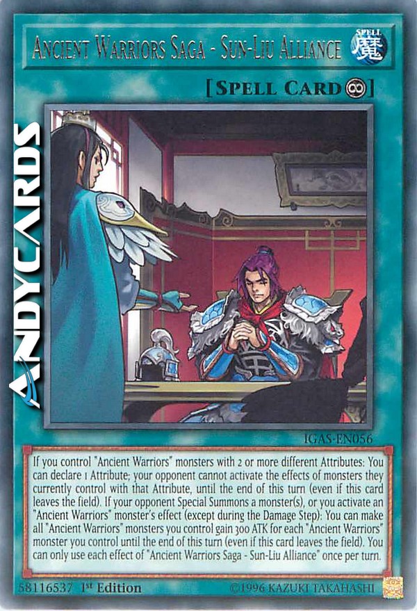 If you control "Ancient Warriors" monsters with 2 or more different Attributes: You can declare 1 Attribute; your opponent cannot activate the effects of monsters they currently control with that Attribute, until the end of this turn (even if this card leaves the field). If your opponent Special Summons a monster(s), or you activate an "Ancient Warriors" monster's effect (except during the Damage Step): You can make all "Ancient Warriors" monsters you control gain 300 ATK for each "Ancient Warriors" monster you control until the end of this turn (even if this card leaves the field). You can only use each effect of "Ancient Warriors Saga - Sun-Liu Alliance" once per turn.