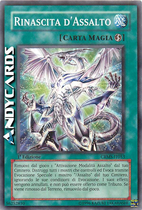 Rimuovi dal gioco un"attivazione modalità assalto"dal tuo cimitero.Distruggi tutti i mostri che controlli ed evoca tramite evocazione speciale 1 mostro "/assalto"dal tuo cimitero,ignorando le sue condizioni di evocazione.I suoi effetti vengono annulati, e non può essere offerto come tributo.Se viene rimosso dal terreno,rimuovilo dal gioco.