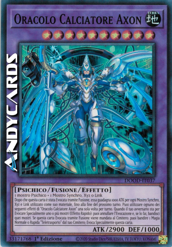 Dopo che questa carta è stata Evocata tramite Fusione, essa guadagna 1000 ATK per ogni Mostro Synchro, Xyz e Link utilizzato come suo materiale, fino alla fine del prossimo turno. Puoi utilizzare ognuno dei seguenti effetti di "Oracolo Calciatore Axon" una sola volta per turno. Quando il tuo avversario sta per Evocare Specialmente uno o più mostri (Effetto Rapido): puoi annullare l'Evocazione e, se lo fai, bandisci quei mostri. Se questa carta Evocata tramite Fusione viene mandata al Cimitero: puoi bandire 1 Magia Normale o Rapida "Teletrasporto" dal tuo Cimitero; Evoca Specialmente questa carta.