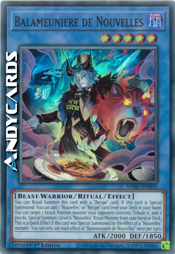 You can Ritual Summon this card with a "Recipe" card. If this card is Special Summoned: You can add 1 "Nouvelles" or "Recipe" card from your Deck to your hand. You can target 1 Attack Position monster your opponent controls; Tribute it, and if you do, Special Summon 1 Level 6 "Nouvelles" Ritual Monster from your hand or Deck. This is a Quick Effect if this card was Special Summoned by the effect of a "Nouvelles" monster. You can only use each effect of "Balameuniere de Nouvelles" once per turn.