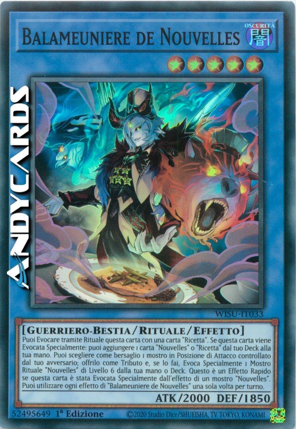 Puoi Evocare tramite Rituale questa carta con una carta "Ricetta". Se questa carta viene Evocata Specialmente: puoi aggiungere 1 carta "Nouvelles" o "Ricetta" dal tuo Deck alla tua mano. Puoi scegliere come bersaglio 1 mostro in Posizione di Attacco controllato dal tuo avversario; offrilo come Tributo e, se lo fai, Evoca Specialmente 1 Mostro Rituale "Nouvelles" di Livello 6 dalla tua mano o Deck. Questo è un Effetto Rapido se questa carta è stata Evocata Specialmente dall'effetto di un mostro "Nouvelles". Puoi utilizzare ogni effetto di "Balameuniere de Nouvelles" una sola volta per turno.