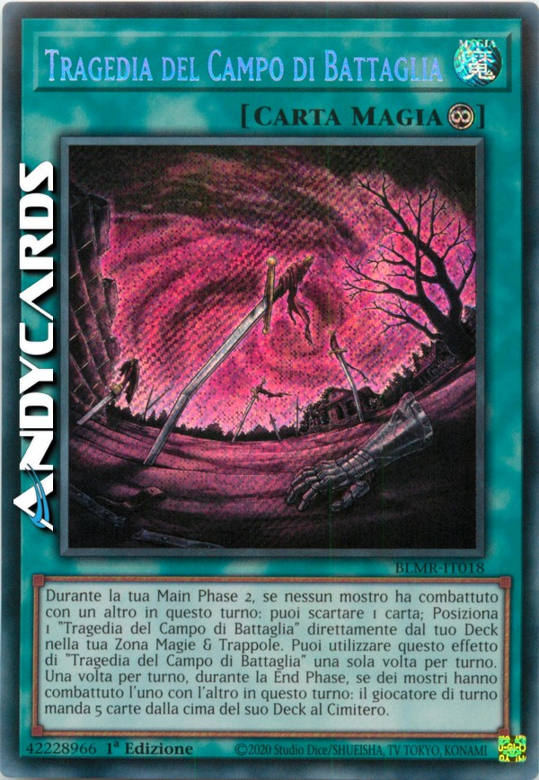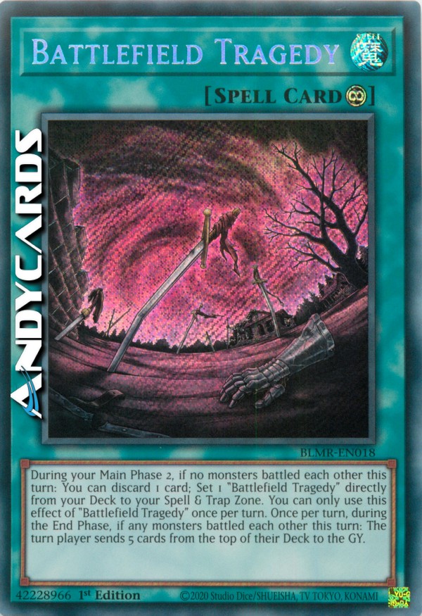 Durante la tua Main Phase 2, se nessun mostro ha combattuto con un altro in questo turno: puoi scartare 1 carta; Posiziona 1 "Tragedia del Campo di Battaglia" direttamente dal tuo Deck nella tua Zona Magie & Trappole. Puoi utilizzare questo effetto di "Tragedia del Campo di Battaglia" una sola volta per turno. Una volta per turno, durante la End Phase, se dei mostri hanno combattuto l'uno con l'altro in questo turno: il giocatore di turno manda 5 carte dalla cima del suo Deck al Cimitero.