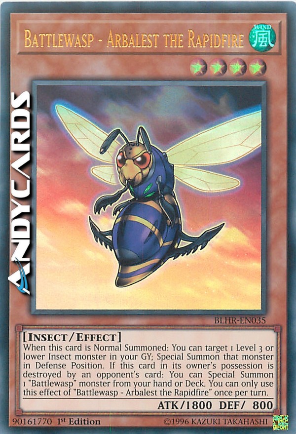 When this card is Normal Summoned: You can target 1 Level 3 or lower Insect monster in your GY; Special Summon that monster in Defense Position. If this card in its owner's possession is destroyed by an opponent's card: You can Special Summon 1 "Battlewasp" monster from your hand or Deck. You can only use this effect of "Battlewasp - Arbalest the Rapidfire" once per turn.
