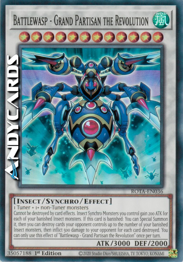 Cannot be destroyed by card effects. Insect Synchro Monsters you control gain 200 ATK for each of your banished Insect monsters. If this card is banished: You can Special Summon it, then you can destroy cards your opponent controls up to the number of your banished Insect monsters, then inflict 500 damage to your opponent for each card destroyed. You can only use this effect of "Battlewasp - Grand Partisan the Revolution" once per turn.