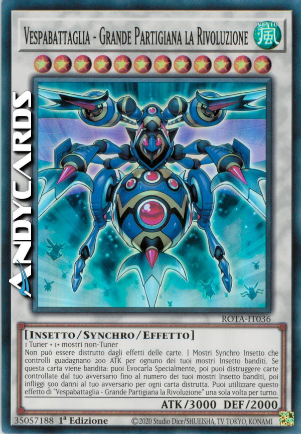 Non può essere distrutto dagli effetti delle carte. I Mostri Synchro Insetto che controlli guadagnano 200 ATK per ognuno dei tuoi mostri Insetto banditi. Se questa carta viene bandita: puoi Evocarla Specialmente, poi puoi distruggere carte controllate dal tuo avversario fino al numero dei tuoi mostri Insetto banditi, poi infliggi 500 danni al tuo avversario per ogni carta distrutta. Puoi utilizzare questo effetto di "Vespabattaglia - Grande Partigiana la Rivoluzione" una sola volta per turno.