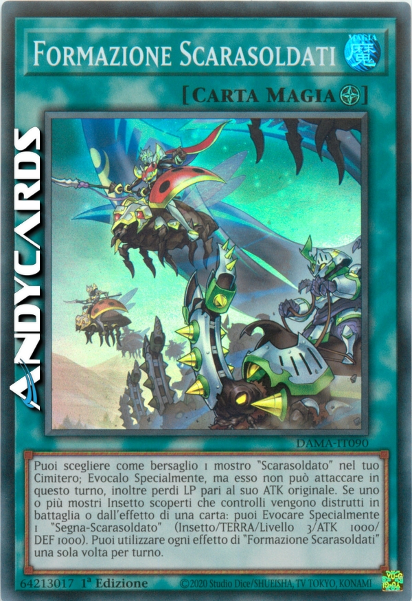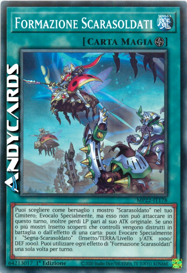 Puoi scegliere come bersaglio 1 mostro "Scarasoldato" nel tuo Cimitero; Evocalo Specialmente, ma esso non può attaccare in questo turno, inoltre perdi LP pari al suo ATK originale. Se uno o più mostri Insetto scoperti che controlli vengono distrutti in battaglia o dall'effetto di una carta: puoi Evocare Specialmente 1 "Segna-Scarasoldato" (Insetto/TERRA/Livello 3/ATK 1000/DEF 1000). Puoi utilizzare ogni effetto di "Formazione Scarasoldati" una sola volta per turno.