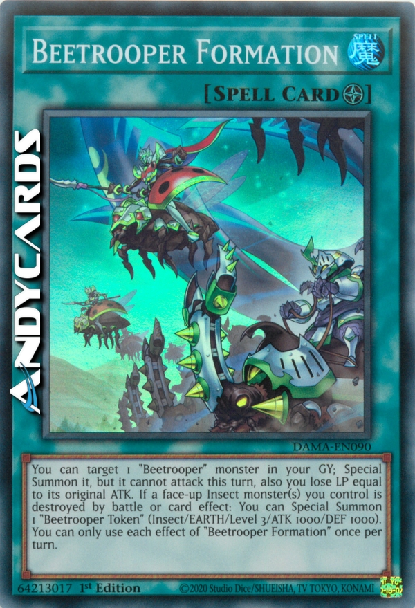 You can target 1 "Beetrooper" monster in your GY; Special Summon it, but it cannot attack this turn, also you lose LP equal to its original ATK. If a face-up Insect monster(s) you control is destroyed by battle or card effect: You can Special Summon 1 "Beetrooper Token" (Insect/EARTH/Level 3/ATK 1000/DEF 1000). You can only use each effect of "Beetrooper Formation" once per turn.