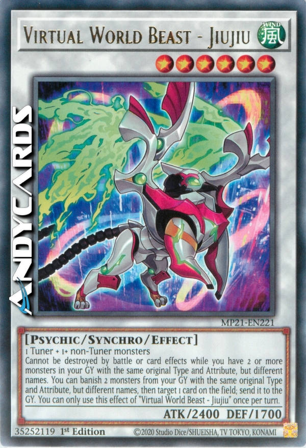 Cannot be destroyed by battle or card effects while you have 2 or more monsters in your GY with the same original Type and Attribute, but different names. You can banish 2 monsters from your GY with the same original Type and Attribute, but different names, then target 1 card on the field; send it to the GY. You can only use this effect of "Virtual World Beast - Jiujiu" once per turn.