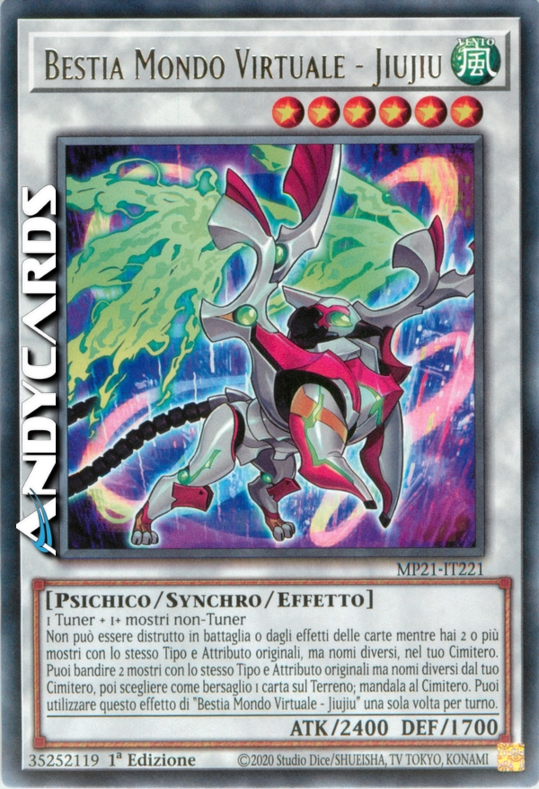 Non può essere distrutto in battaglia o dagli effetti delle carte mentre hai 2 o più mostri con lo stesso Tipo e Attributo originali, ma nomi diversi, nel tuo Cimitero. Puoi bandire 2 mostri con lo stesso Tipo e Attributo originali ma nomi diversi dal tuo Cimitero, poi scegliere come bersaglio 1 carta sul Terreno; mandala al Cimitero. Puoi utilizzare questo effetto di "Bestia Mondo Virtuale - Jiujiu" una sola volta per turno.