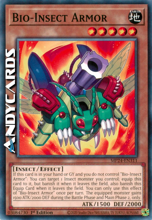 Se questa carta è nella tua mano o Cimitero e tu non controlli "Armatura Bio-Insetto": puoi scegliere come bersaglio 1 mostro Insetto che controlli; equipaggia questa carta a esso, ma bandiscila quando lascia il Terreno, inoltre bandisci questa Carta Equipaggiamento quando essa lascia il Terreno. Puoi utilizzare questo effetto di "Armatura Bio-Insetto" una sola volta per turno. Il mostro equipaggiato guadagna 1500 ATK/2000 DEF solamente durante la Battle Phase e la Main Phase 2.