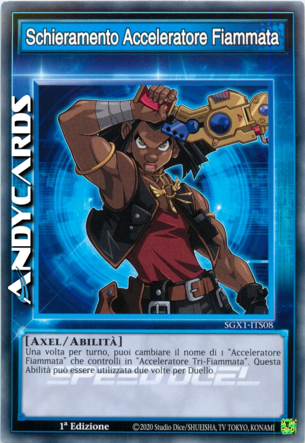 Una volta per turno, puoi cambiare il nome di 1 "Acceleratore Fiammata" che controlli in "Acceleratore Tri-Fiammata". Questa abilità può essere utilizzata due volte per Duello.