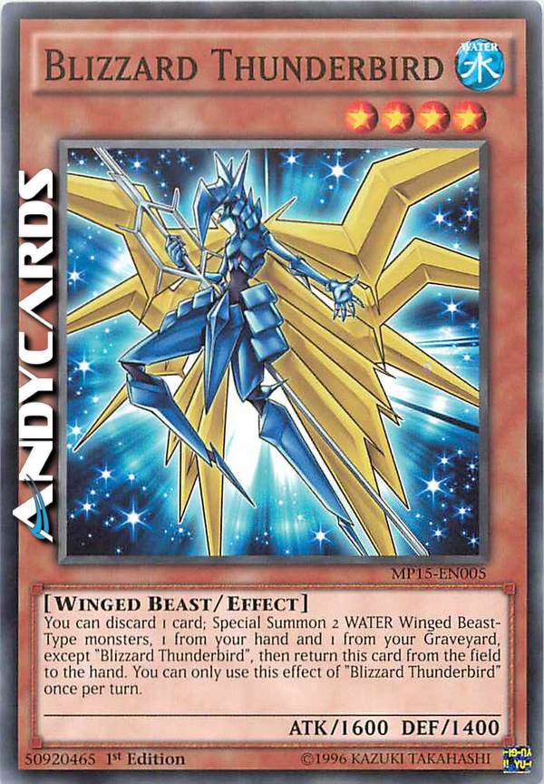 You can discard 1 card; Special Summon 2 WATER Winged-Beast-Type monsters, 1 from your hand and 1 from your Graveyard, except "Blizzard Thunderbird", then return this card from the field to the hand. You can only use this effect of "Blizzard Thunderbird" once per turn.