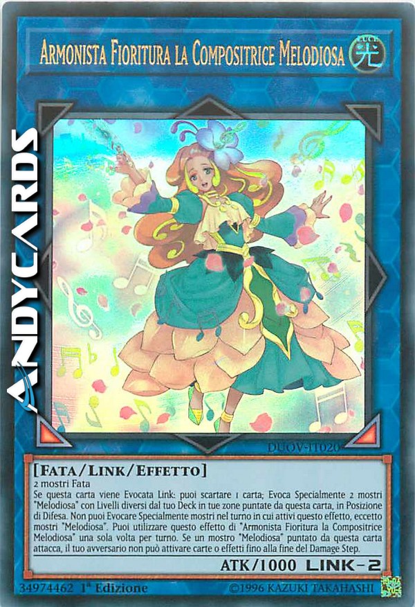 Se questa carta viene Evocata Link: puoi scartare 1 carta; Evoca Specialmente 2 mostri "Melodiosa" con Livelli diversi dal tuo Deck in tue zone puntate da questa carta, in Posizione di Difesa. Non puoi Evocare Specialmente mostri nel turno in cui attivi questo effetto, eccetto mostri "Melodiosa". Puoi utilizzare questo effetto di "Armonista Fioritura la Compositrice Melodiosa" una sola volta per turno. Se un mostro "Melodiosa" puntato da questa carta attacca, il tuo avversario non può attivare carte o effetti fino alla fine del Damage Step.