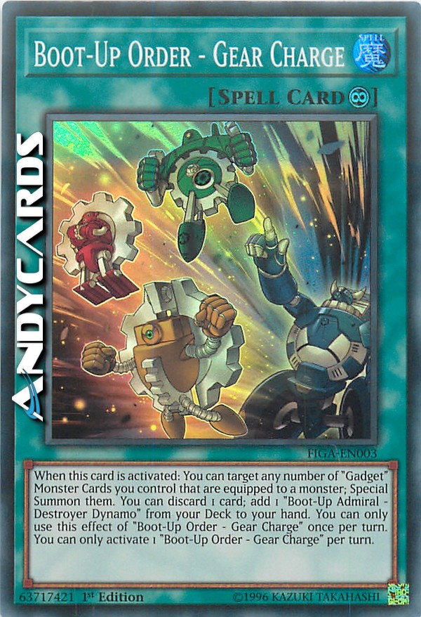 When this card is activated: You can target any number of "Gadget" Monster Cards you control that are equipped to a monster; Special Summon them. You can discard 1 card; add 1 "Boot-Up Admiral - Destroyer Dynamo" from your Deck to your hand. You can only use this effect of "Boot-Up Order - Gear Charge" once per turn. You can only activate 1 "Boot-Up Order - Gear Charge" per turn.