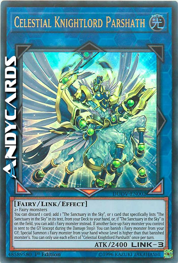 You can discard 1 card; add 1 "The Sanctuary in the Sky", or 1 card that specifically lists "The Sanctuary in the Sky" in its text, from your Deck to your hand, or, if "The Sanctuary in the Sky" is on the field, you can add 1 Fairy monster instead. If another face-up Fairy monster you control is sent to the GY (except during the Damage Step): You can banish 1 Fairy monster from your GY; Special Summon 1 Fairy monster from your hand whose Level is higher than that banished monster's. You can only use each effect of "Celestial Knightlord Parshath" once per turn.
