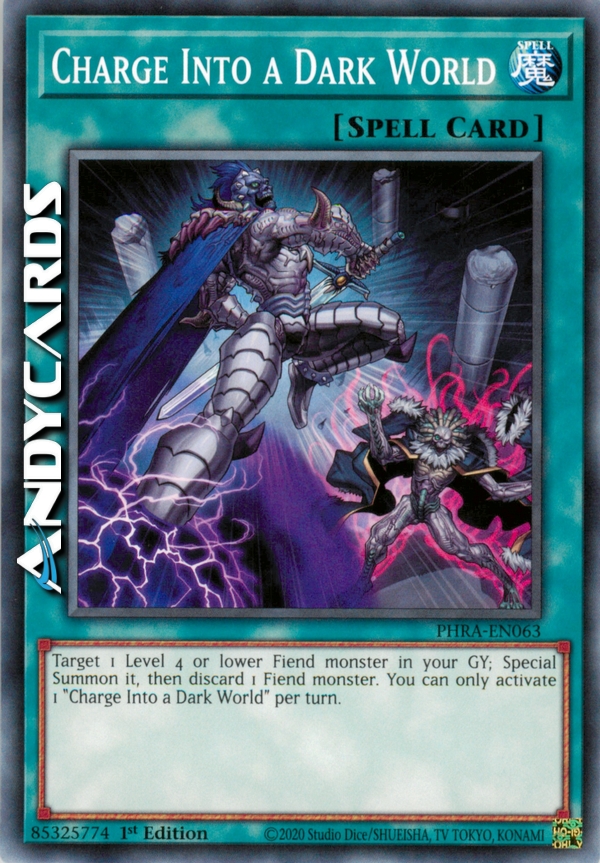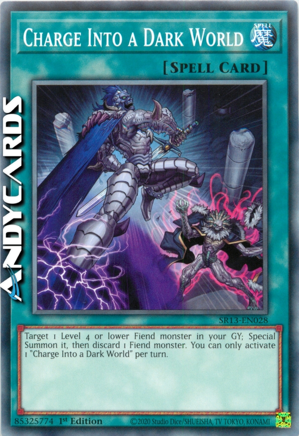 Target 1 Level 4 or lower Fiend monster in your GY; Special Summon it, then discard 1 Fiend monster. You can only activate 1 "Charge Into a Dark World" per turn.