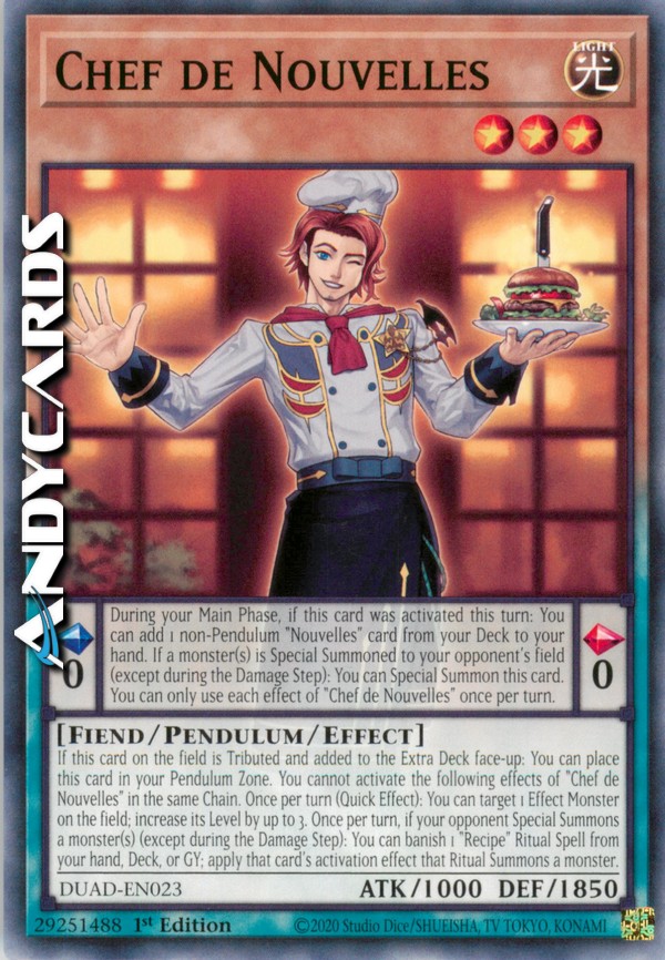 Pendulum Effect: During your Main Phase, if this card was activated this turn: You can add 1 non-Pendulum "Nouvelles" card from your Deck to your hand. If a monster(s) is Special Summoned to your opponent's field (except during the Damage Step): You can Special Summon this card. You can only use each effect of "Chef de Nouvelles" once per turn.