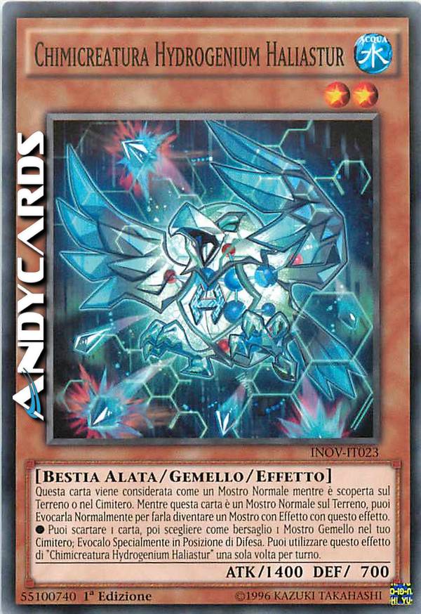 Questa carta viene considerata come un Mostro Normale mentre è scoperta sul Terreno o nel Cimitero. Mentre questa carta è un Mostro Normale sul Terreno, puoi Evocarla Normalmente per farla diventare un Mostro con Effetto con questo effetto. - Puoi scartare 1 carta, poi scegliere come bersaglio 1 Mostro Gemello nel tuo Cimitero; Evocalo Specialmente in Posizione di Difesa. Puoi utilizzare questo effetto di "Chimicreatura Hydrogenium Haliastur" una sola volta per turno.