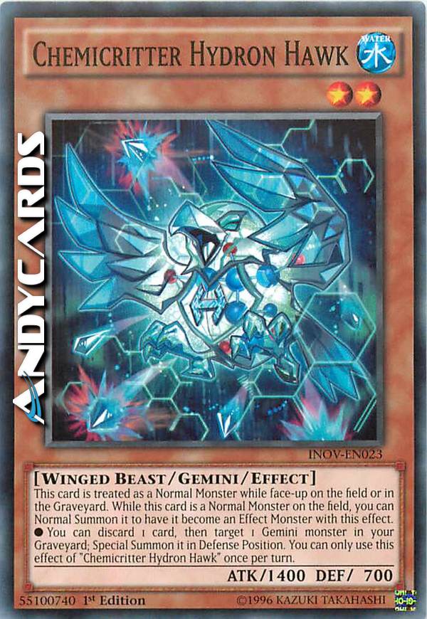 This card is treated as a Normal Monster while face-up on the field or in the Graveyard. While this card is a Normal Monster on the field, you can Normal Summon it to have it become an Effect Monster with this effect. You can discard 1 card, then target 1 Gemini monster in your Graveyard; Special Summon it in Defense Position. You can only use this effect of "Chemicritter Hydron Hawk" once per turn.