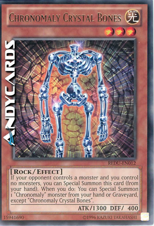 If your opponent controls a monster and you control no monsters, you can Special Summon this card (from your hand). When you do: You can Special Summon 1 "Chronomaly" monster from your hand or Graveyard, except "Chronomaly Crystal Bones".