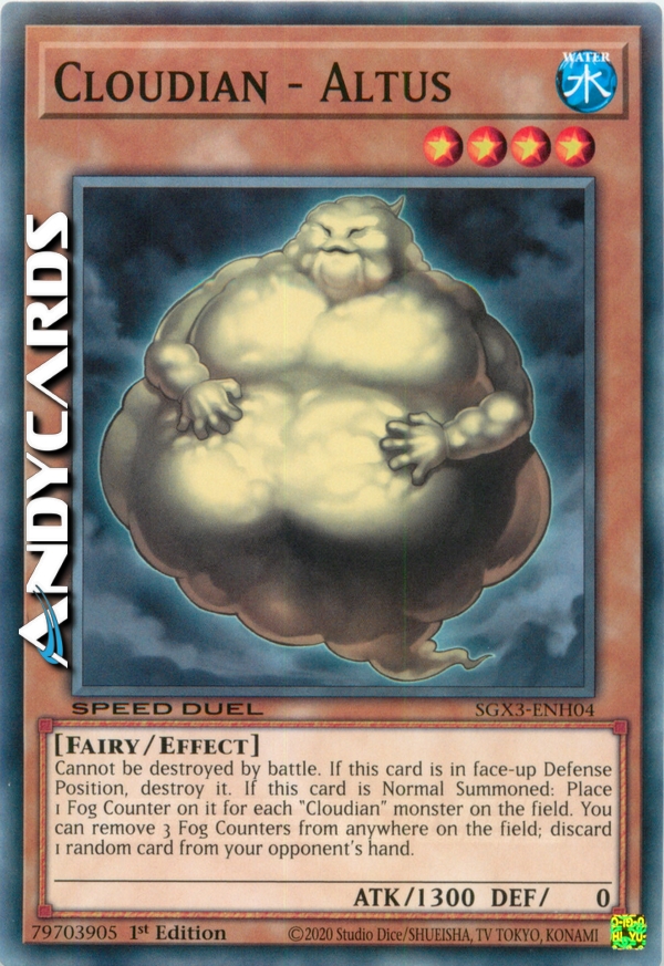 Cannot be destroyed by battle. If this card is in face-up Defense Position, destroy it. If this card is Normal Summoned: Place 1 Fog Counter on it for each "Cloudian" monster on the field. You can remove 3 Fog Counters from anywhere on the field; discard 1 random card from your opponent's hand.