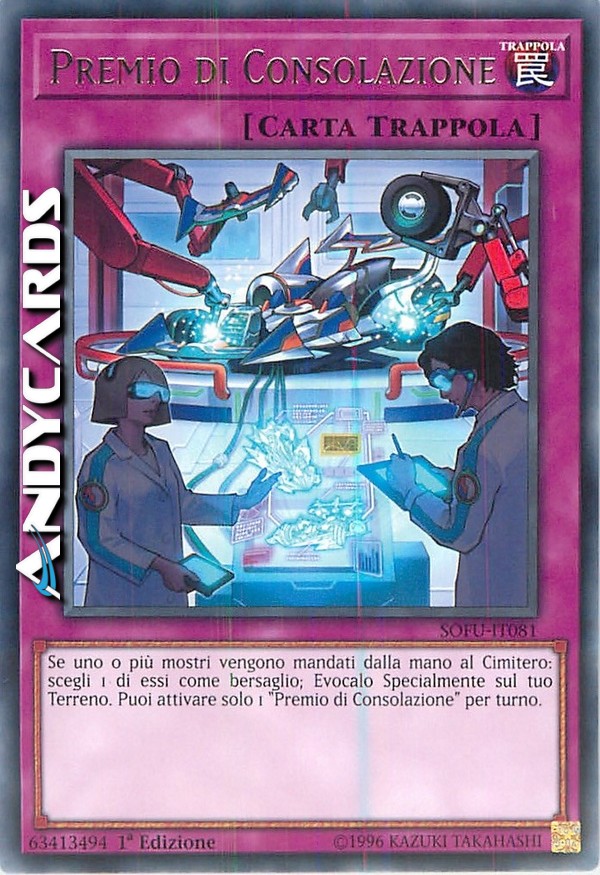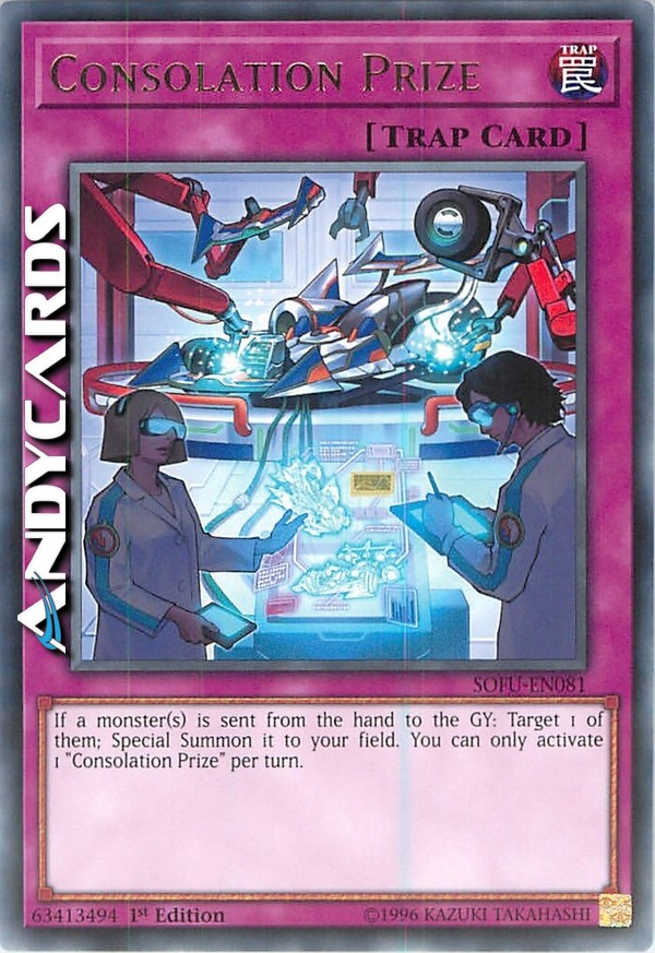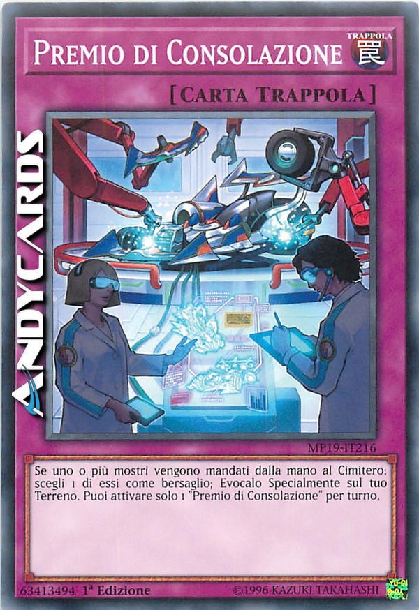 Se uno o più mostri vengono mandati dalla mano al Cimitero: scegli 1 di essi come bersaglio; Evocalo Specialmente sul tuo Terreno. Puoi attivare solo 1 "Premio di Consolazione" per turno.