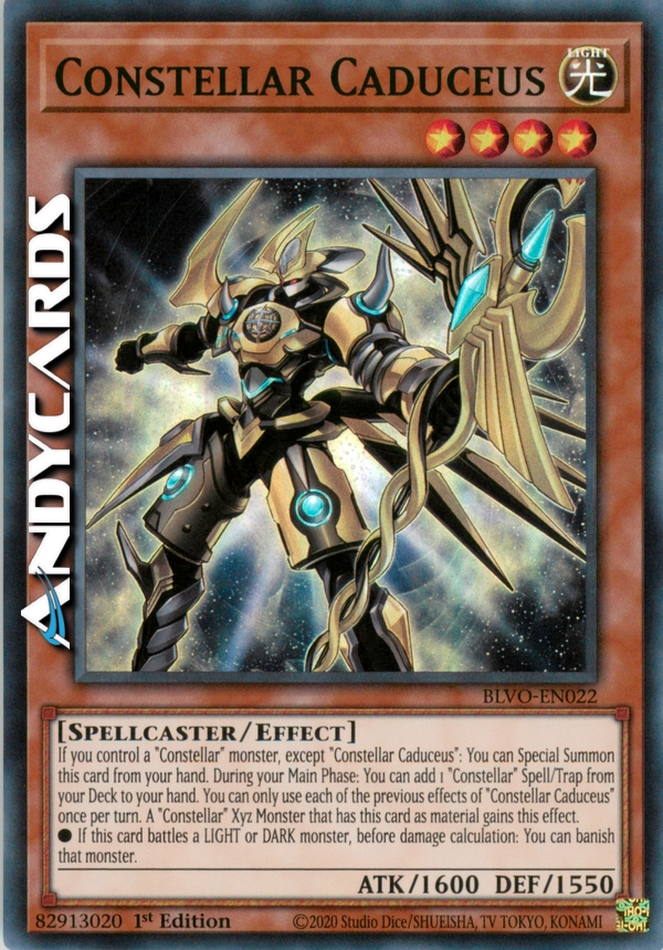 Se controlli un mostro "Costellazione", eccetto "Costellazione Caduceo": puoi Evocare Specialmente questa carta dalla tua mano. Durante la tua Main Phase: puoi aggiungere 1 Magia/Trappola "Costellazione" dal tuo Deck alla tua mano. Puoi utilizzare ognuno dei precedenti effetti di "Costellazione Caduceo" una sola volta per turno. Un Mostro Xyz "Costellazione" che ha questa carta come materiale guadagna questo effetto.