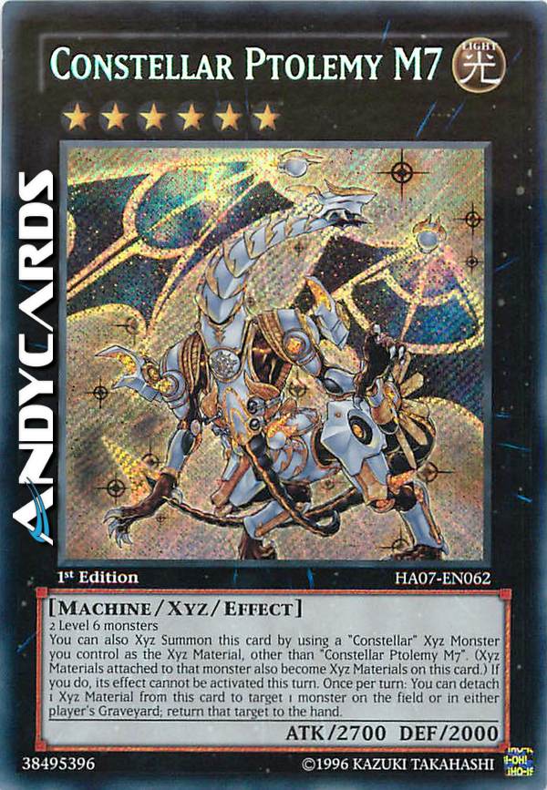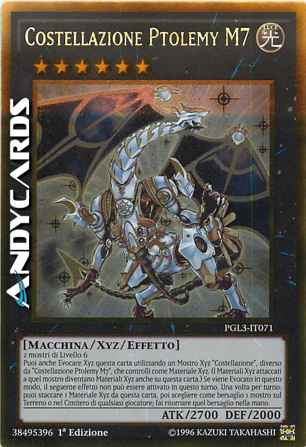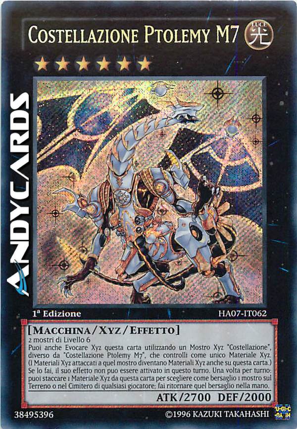 2 mostri di Livello 6 - Puoi anche Evocare Xyz questa carta utilizzando un Mostro Xyz "Costellazione", diverso da "Costellazione Ptolemy M7", che controlli come Materiale Xyz. (I Materiali Xyz attaccati a quel mostro diventano Materiali Xyz anche su questa carta.) Se viene Evocato in questo modo, il seguente effetto non può essere attivato in questo turno. Una volta per turno: puoi staccare 1 Materiale Xyz da questa carta, poi scegliere come bersaglio 1 mostro sul Terreno o nel Cimitero di qualsiasi giocatore; fai ritornare quel bersaglio nella mano.