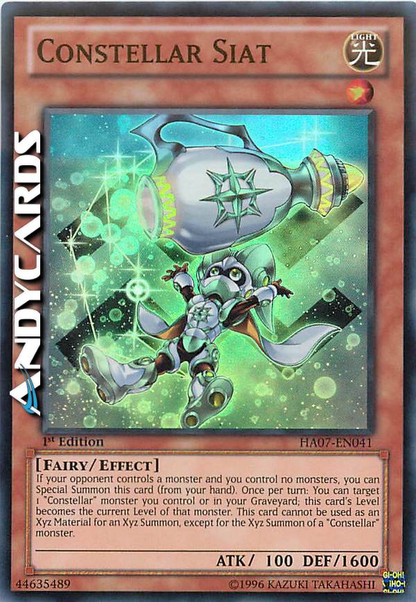 Se il tuo avversario controlla un mostro e tu non ne controlli nessuno, puoi Evocare Specialmente questa carta (dalla tua mano). Una volta per turno: puoi scegliere come bersaglio 1 mostro "Costellazione" che controlli o nel tuo Cimitero; il Livello di questa carta diventa il Livello attuale di quel mostro. Questa carta non può essere utilizzata come Materiale Xyz per un'Evocazione Xyz, eccetto per l'Evocazione Xyz di un mostro "Costellazione".