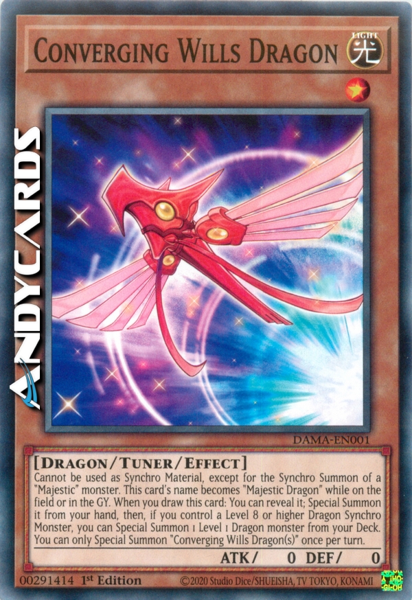 Cannot be used as Synchro Material, except for the Synchro Summon of a "Majestic" monster. This card's name becomes "Majestic Dragon" while on the field or in the GY. When you draw this card: You can reveal it; Special Summon it from your hand, then, if you control a Level 8 or higher Dragon Synchro Monster, you can Special Summon 1 Level 1 Dragon monster from your Deck. You can only Special Summon "Converging Wills Dragon(s)" once per turn.
