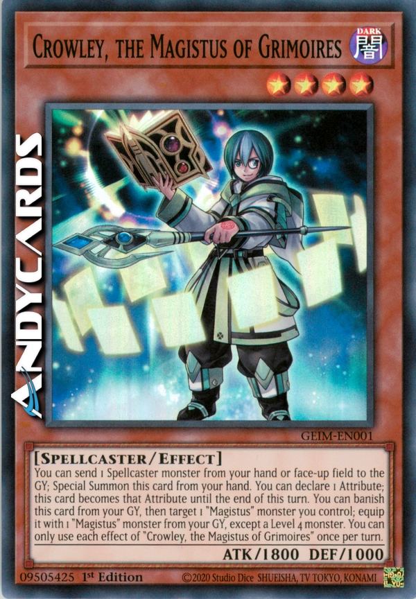 You can send 1 Spellcaster monster from your hand or face-up field to the GY; Special Summon this card from your hand. You can declare 1 Attribute; this card becomes that Attribute until the end of this turn. You can banish this card from your GY, then target 1 "Magistus" monster you control; equip it with 1 "Magistus" monster from your GY, except a Level 4 monster. You can only use each effect of "Crowley, the Magistus of Grimoires" once per turn.