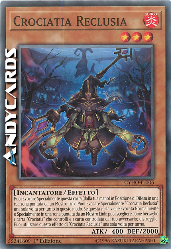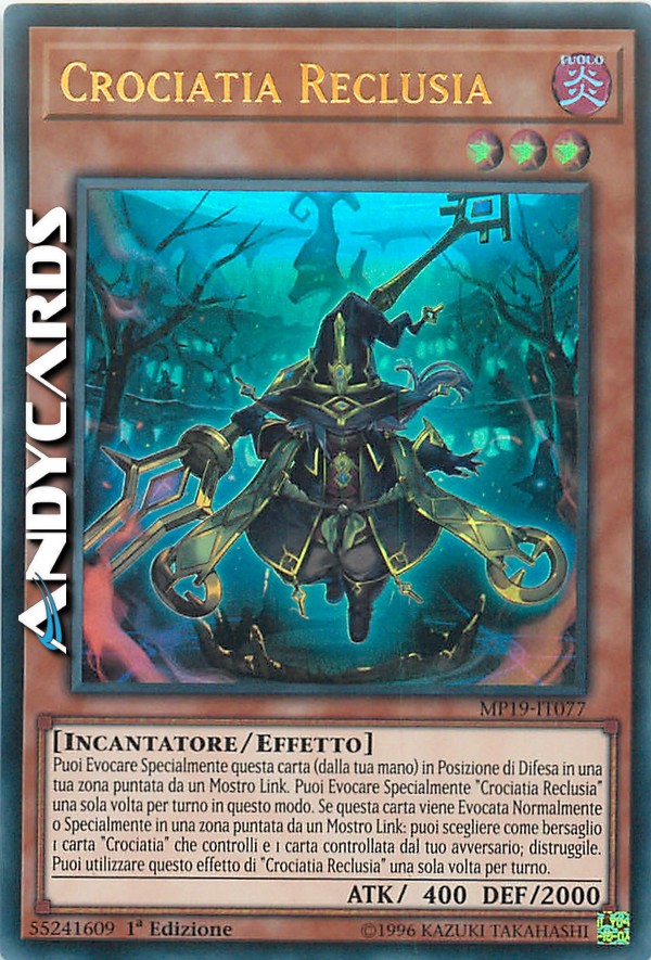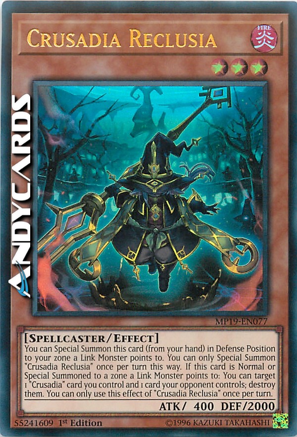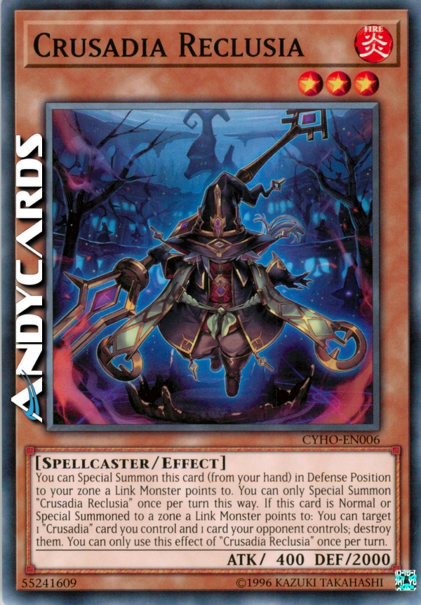 Puoi Evocare Specialmente questa carta (dalla tua mano) in Posizione di Difesa in una tua zona puntata da un Mostro Link. Puoi Evocare Specialmente "Crociatia Reclusia" una sola volta per turno in questo modo. Se questa carta viene Evocata Normalmente o Specialmente in una zona puntata da un Mostro Link: puoi scegliere come bersaglio 1 carta "Crociatia" che controlli e 1 carta controllata dal tuo avversario; distruggile. Puoi utilizzare questo effetto di "Crociatia Reclusia" una sola volta per turno.
