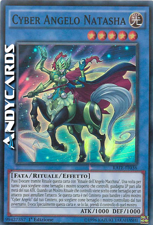 Puoi Evocare tramite Rituale questa carta con "Rituale dell'Angelo Macchina". Una volta per turno: puoi scegliere come bersaglio 1 mostro scoperto che controlli; guadagna LP pari alla metà del suo ATK. Quando un Mostro Rituale che controlli viene scelto come bersaglio per un attacco: puoi annullare l'attacco. Se questa carta è nel Cimitero: puoi bandire 1 altro mostro "Cyber Angelo" dal tuo Cimitero, poi scegliere come bersaglio 1 mostro controllato dal tuo avversario; Evoca Specialmente questa carta e, se lo fai, prendi il controllo di quel mostro.