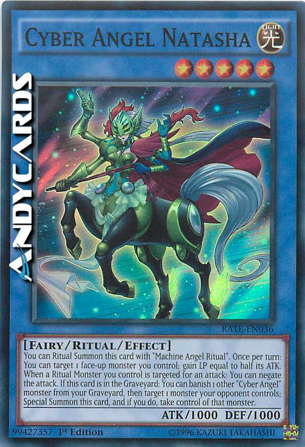 You can Ritual Summon this card with "Machine Angel Ritual". Once per turn: You can target 1 face-up monster you control; gain LP equal to half its ATK. When a Ritual Monster you control is targeted for an attack: You can negate the attack. If this card is in your Graveyard: You can banish 1 other "Cyber Angel" monster from your Graveyard, then target 1 monster your opponent controls; Special Summon this card, and if you do, take control of that monster.