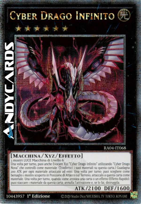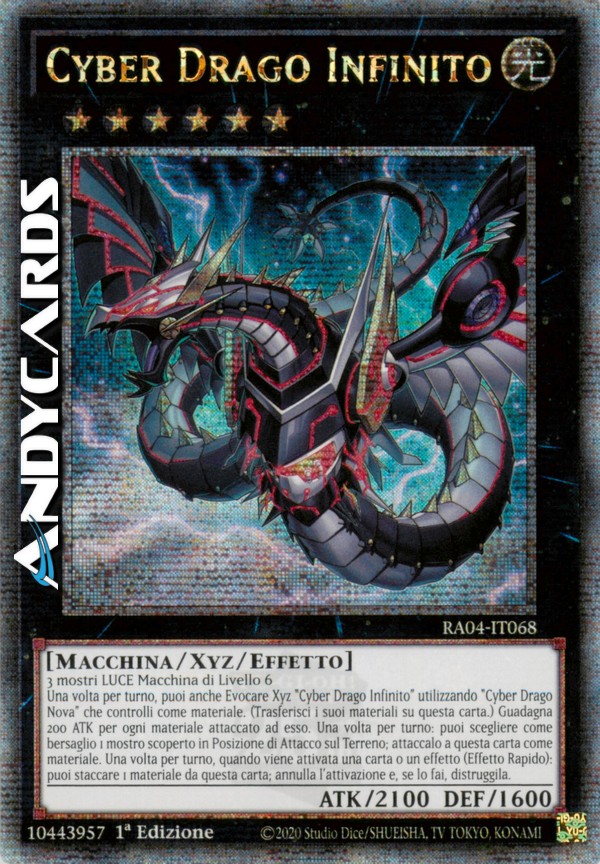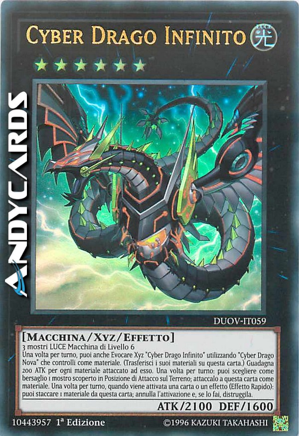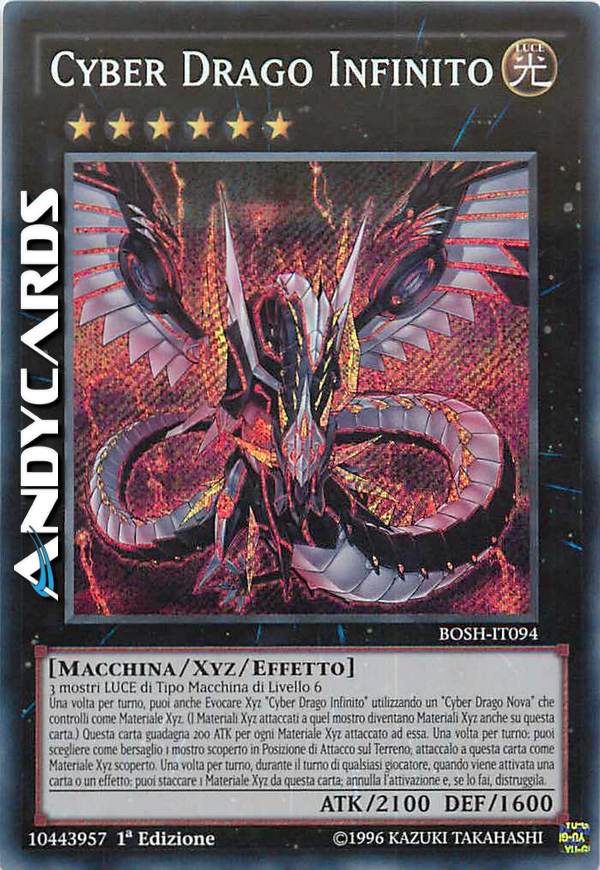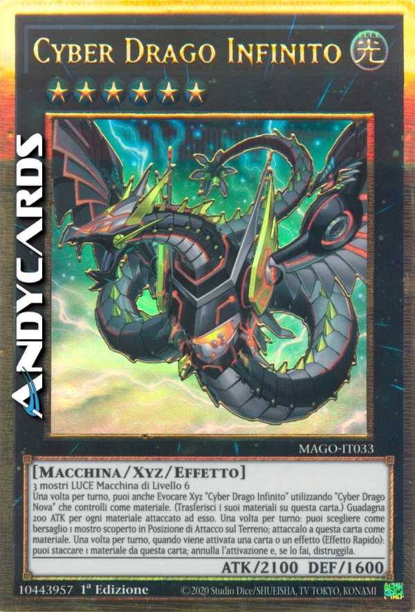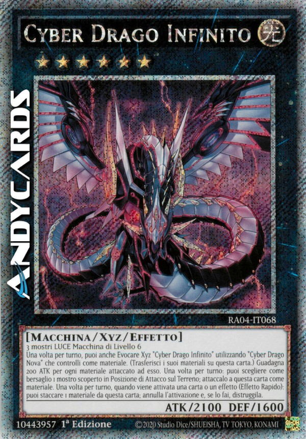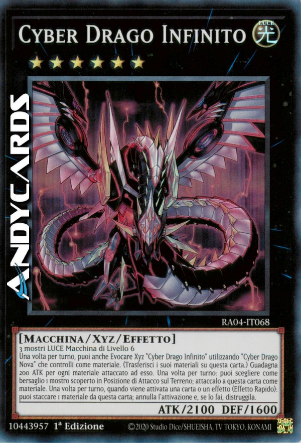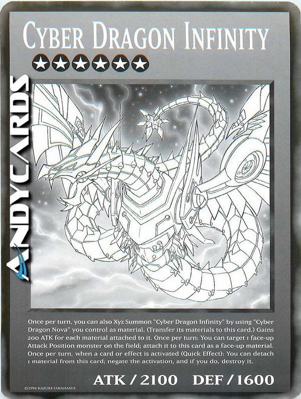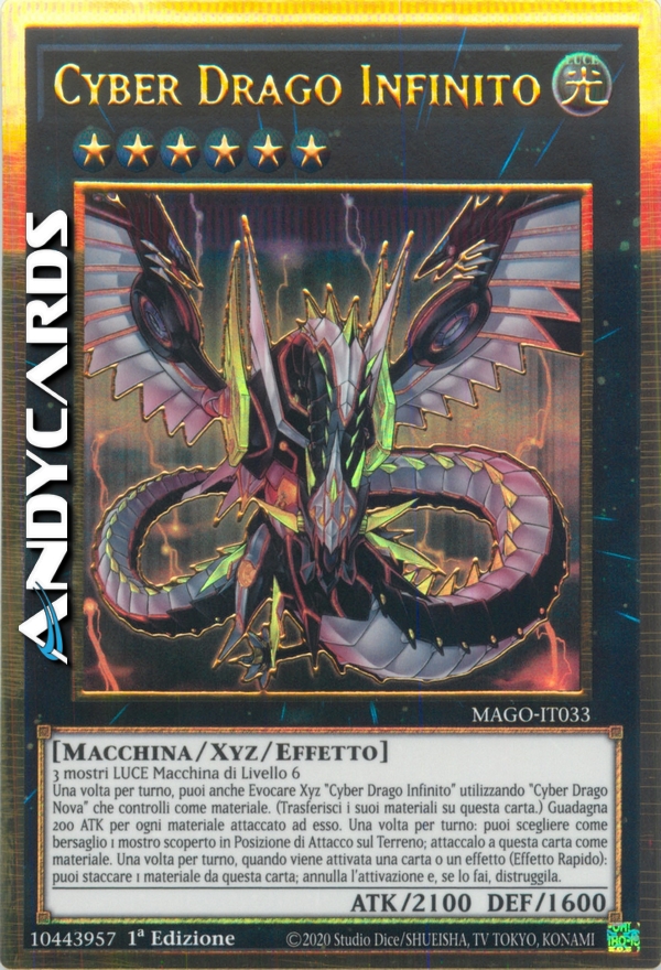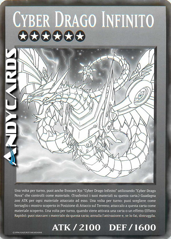 3 mostri LUCE di Tipo Macchina di Livello 6 - Una volta per turno, puoi anche Evocare Xyz "Cyber Drago Infinito" utilizzando un "Cyber Drago Nova" che controlli come Materiale Xyz. (I Materiali Xyz attaccati a quel mostro diventano Materiali Xyz anche su questa carta.) Questa carta guadagna 200 ATK per ogni Materiale Xyz attaccato ad essa. Una volta per turno: puoi scegliere come bersaglio 1 mostro scoperto in Posizione di Attacco sul Terreno; attaccalo a questa carta come Materiale Xyz scoperto. Una volta per turno, durante il turno di qualsiasi giocatore, quando viene attivata una carta o un effetto: puoi staccare 1 Materiale Xyz da questa carta; annulla l'attivazione e, se lo fai, distruggila.