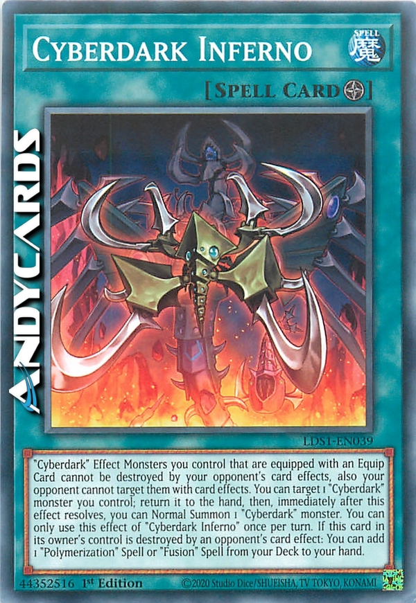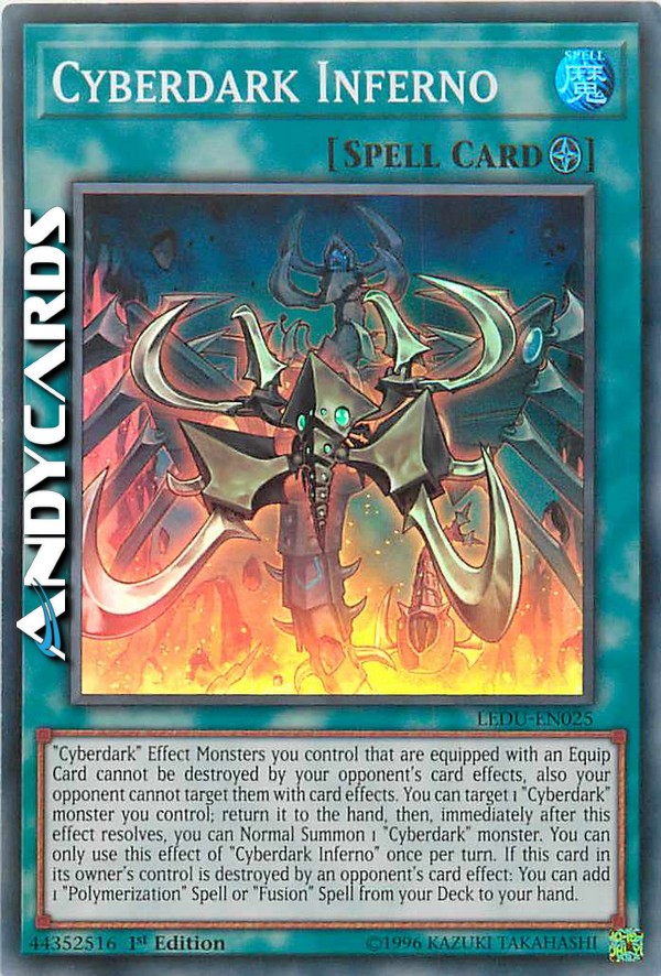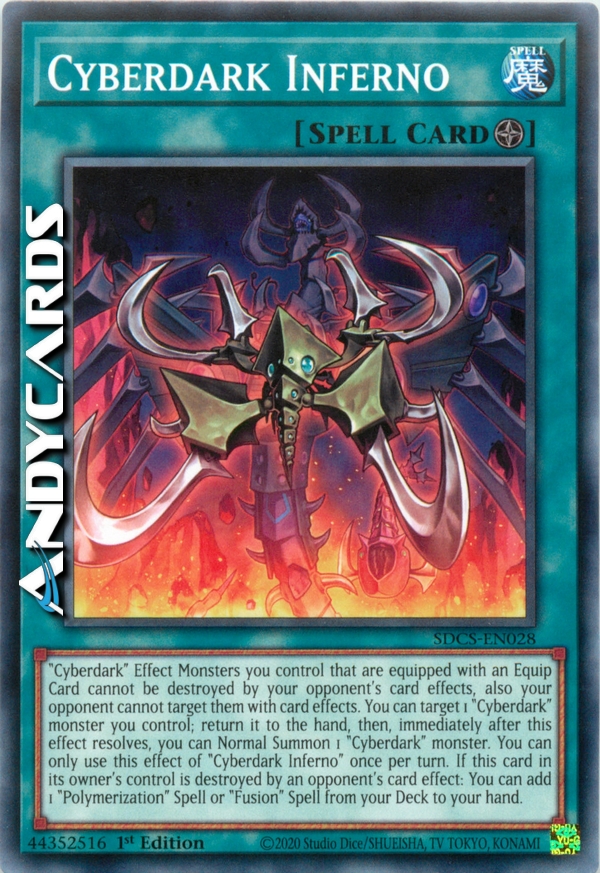 "Cyberdark" Effect Monsters you control that are equipped with an Equip Card cannot be destroyed by your opponent's card effects, also your opponent cannot target them with card effects. You can target 1 "Cyberdark" monster you control; return it to the hand, then, immediately after this effect resolves, you can Normal Summon 1 "Cyberdark" monster. You can only use this effect of "Cyberdark Inferno" once per turn. If this card in its owner's control is destroyed by an opponent's card effect: You can add 1 "Polymerization" Spell or "Fusion" Spell from your Deck to your hand.