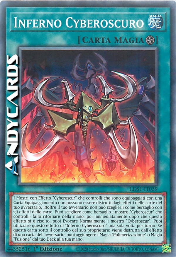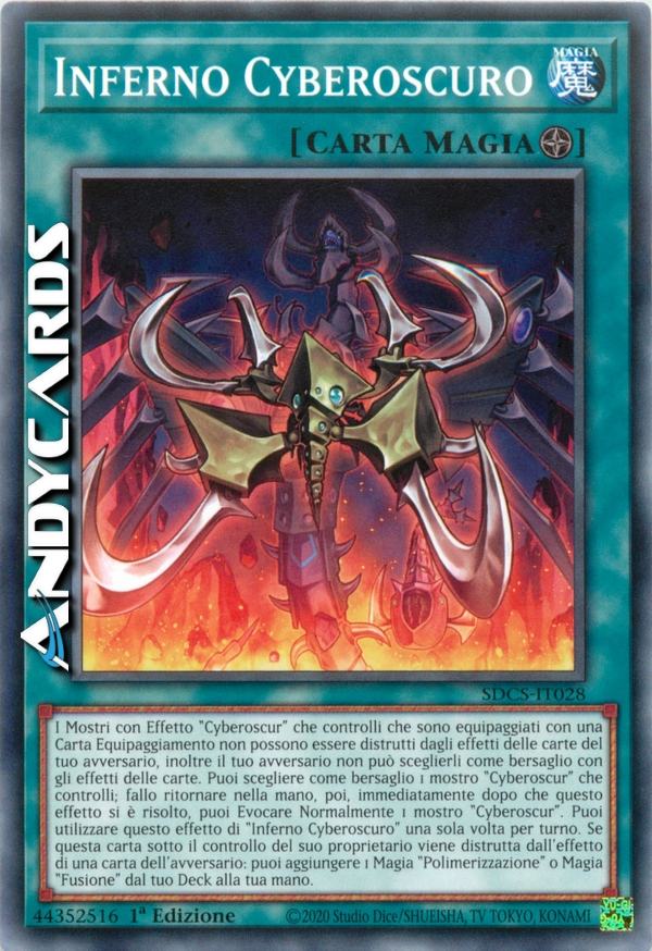 I Mostri con Effetto "Cyberoscur" che controlli che sono equipaggiati con una Carta Equipaggiamento non possono essere distrutti dagli effetti delle carte del tuo avversario, inoltre il tuo avversario non può sceglierli come bersaglio con gli effetti delle carte. Puoi scegliere come bersaglio 1 mostro "Cyberoscur" che controlli; fallo ritornare nella mano, poi, immediatamente dopo che questo effetto si è risolto, puoi Evocare Normalmente 1 mostro "Cyberoscur". Puoi utilizzare questo effetto di "Inferno Cyberoscuro" una sola volta per turno. Se questa carta sotto il controllo del suo proprietario viene distrutta dall'effetto di una carta dell'avversario: puoi aggiungere 1 Magia "Polimerizzazione" o Magia "Fusione" dal tuo Deck alla tua mano.